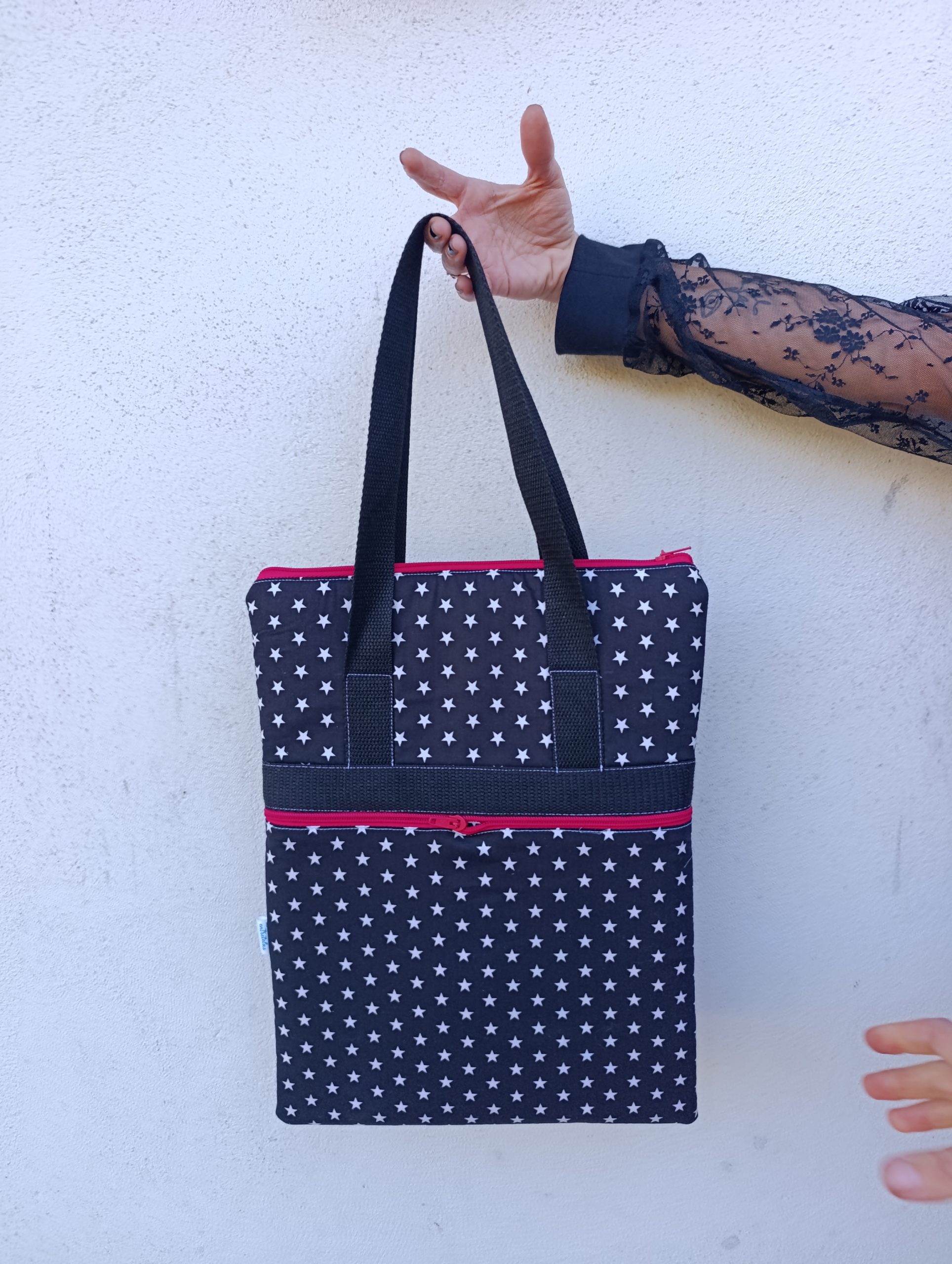 Bolso Estrellas Tamaño Grande  , tejido de algodón orgánico , interior acolchado , dos bolsillos con cremalleras.