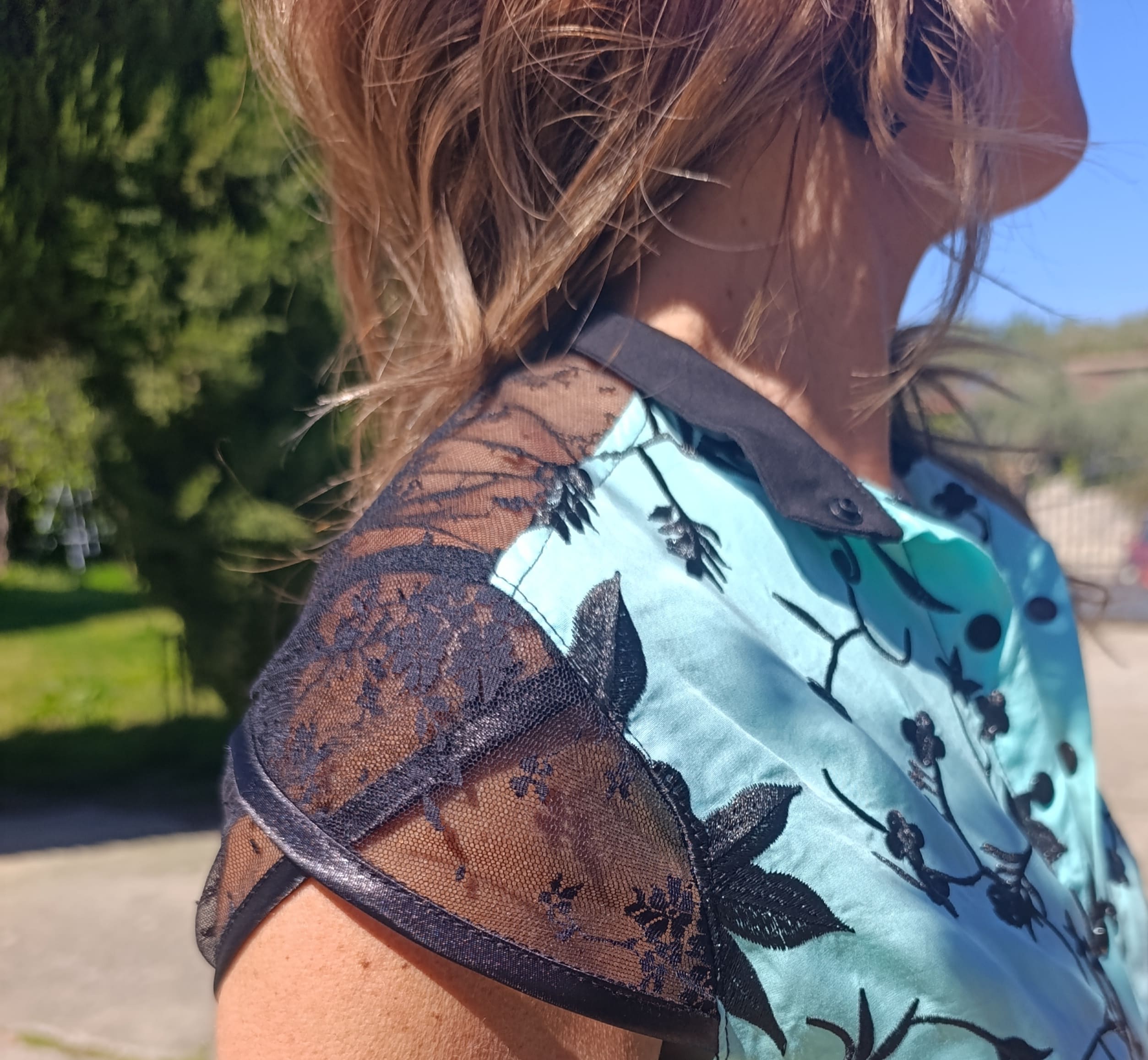La espalda incorpora una pieza de encaje que aligera visualmente el diseño y aporta un contraste delicado. Las mangas tipos tulipán en encaje con un ribete negro brillo.