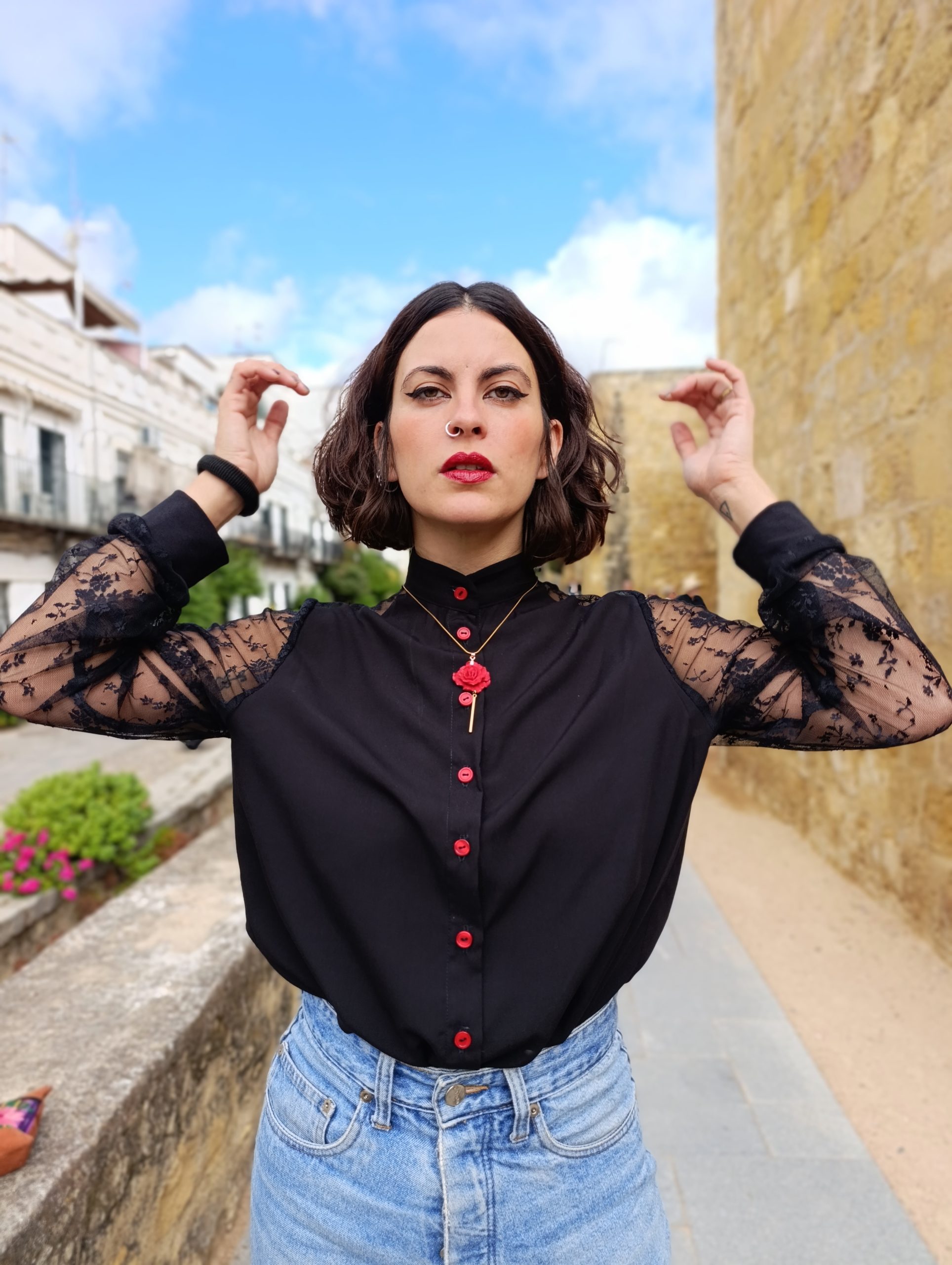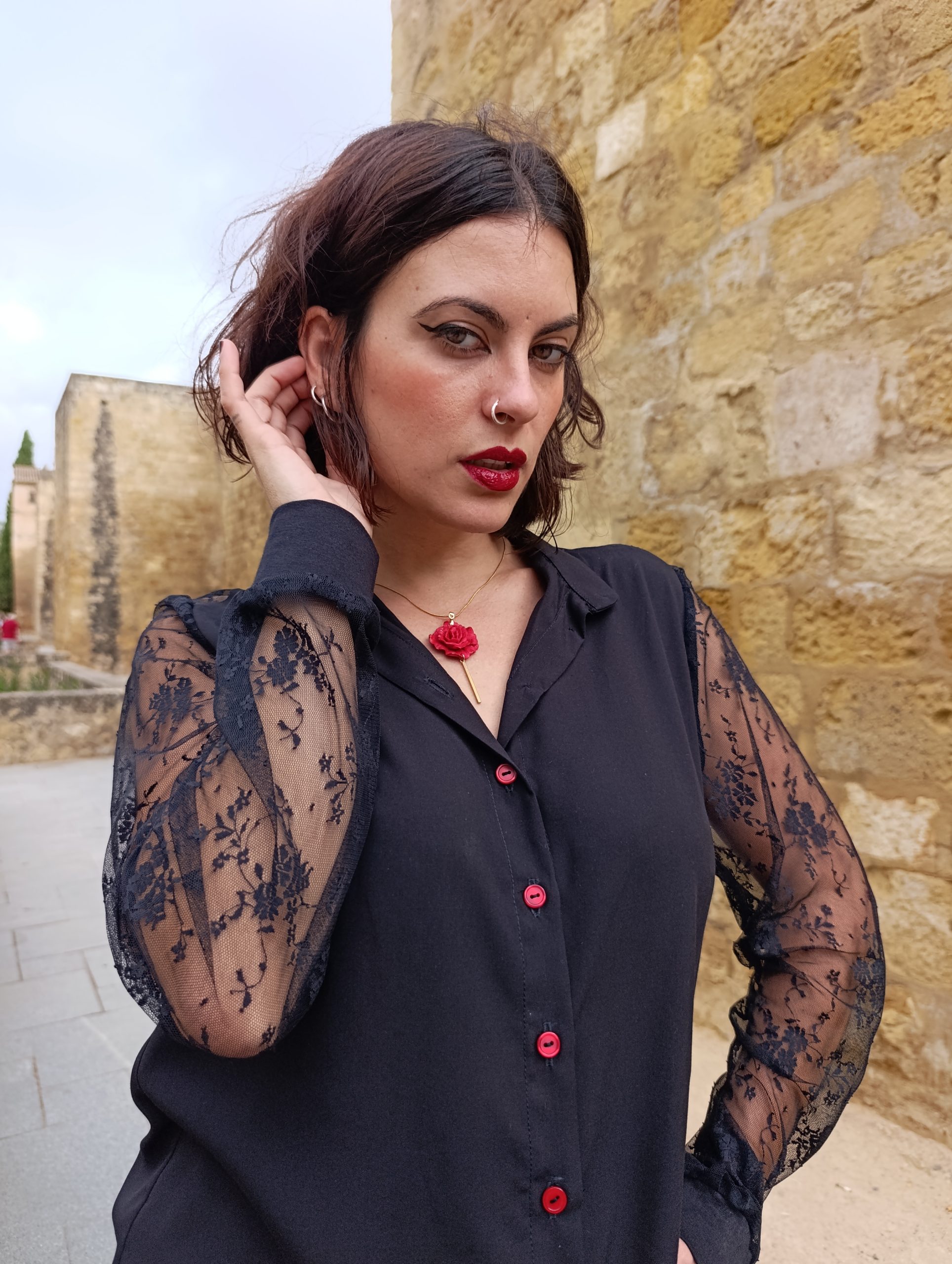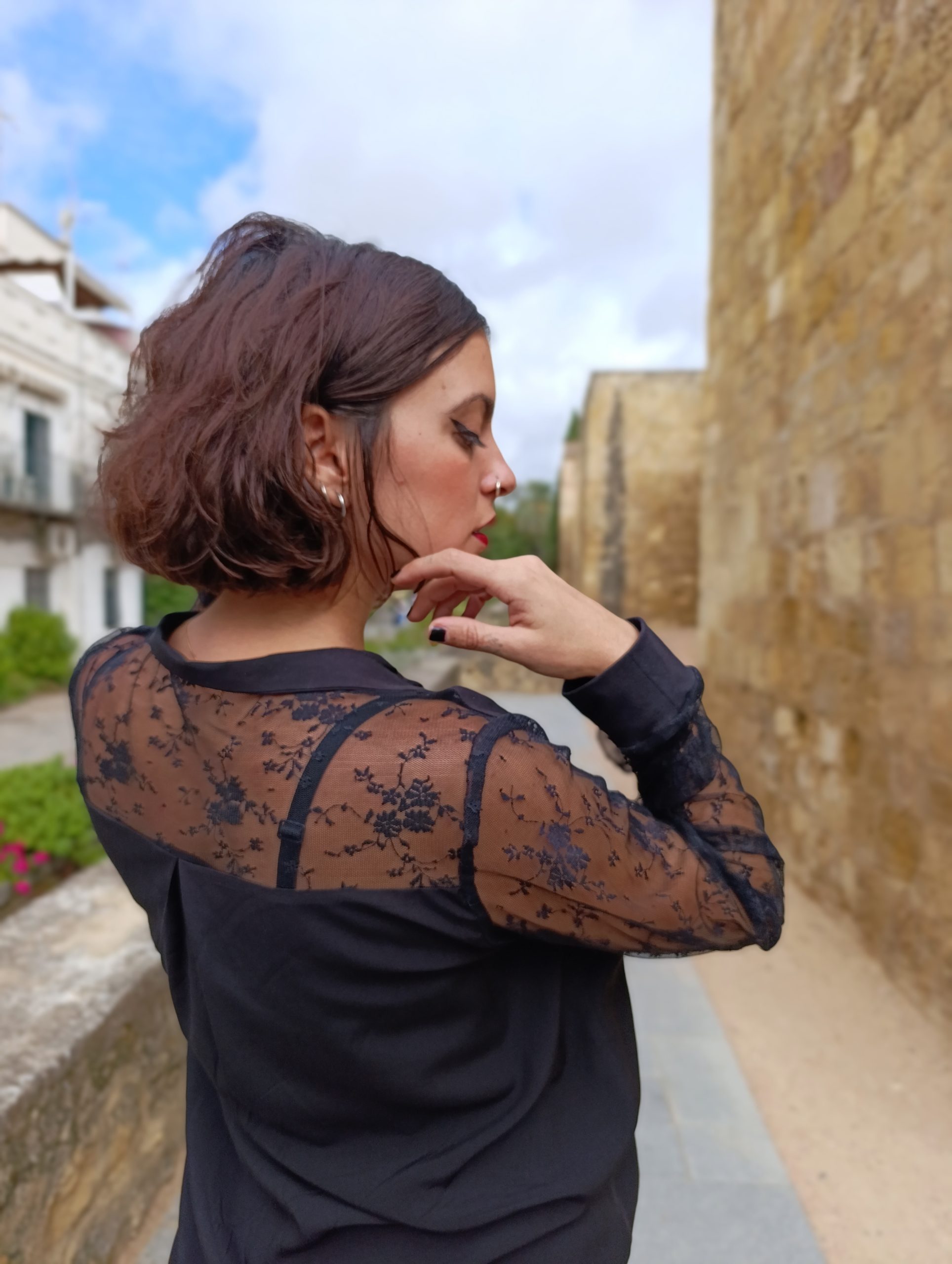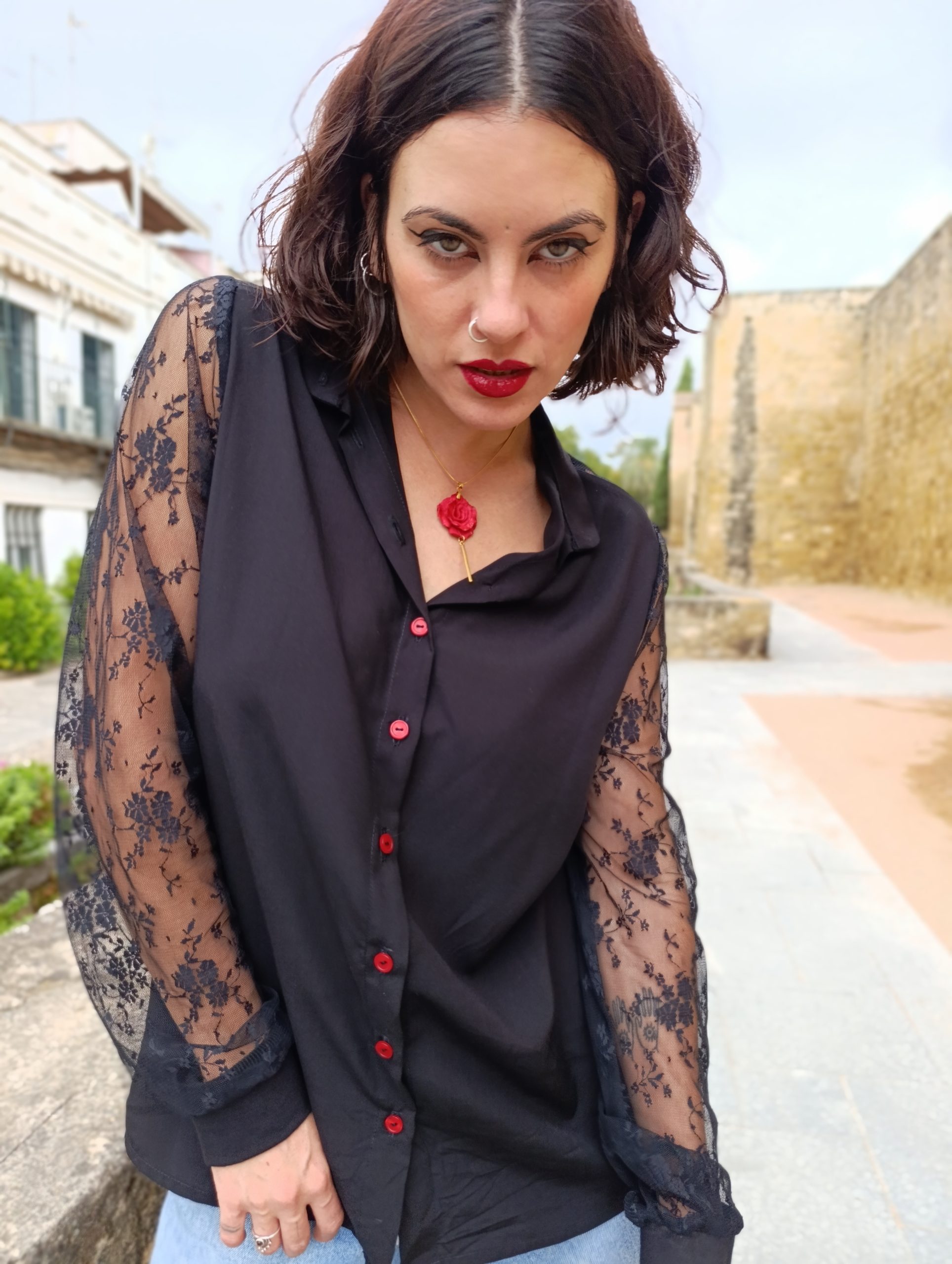 Camisa Cuervo, tejido de viscosa con mucha caída y suave al tacto, cuello tirilla, abotonada, mangas de encaje y puños de punto de algodón.