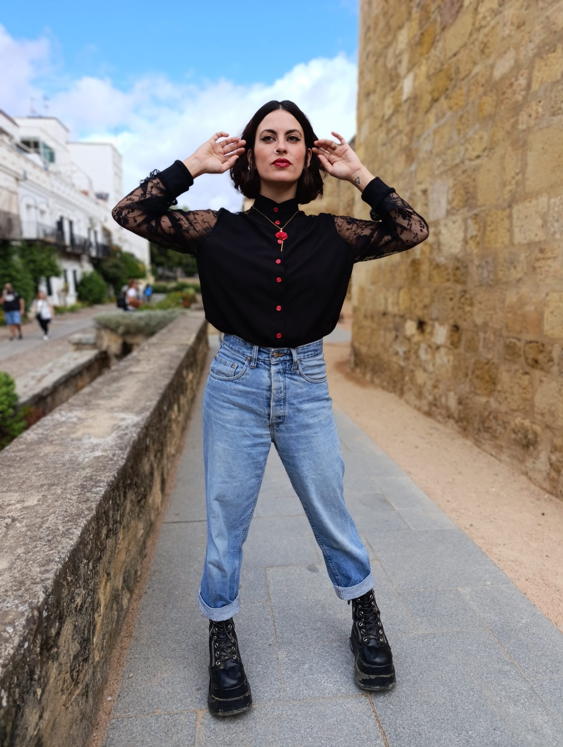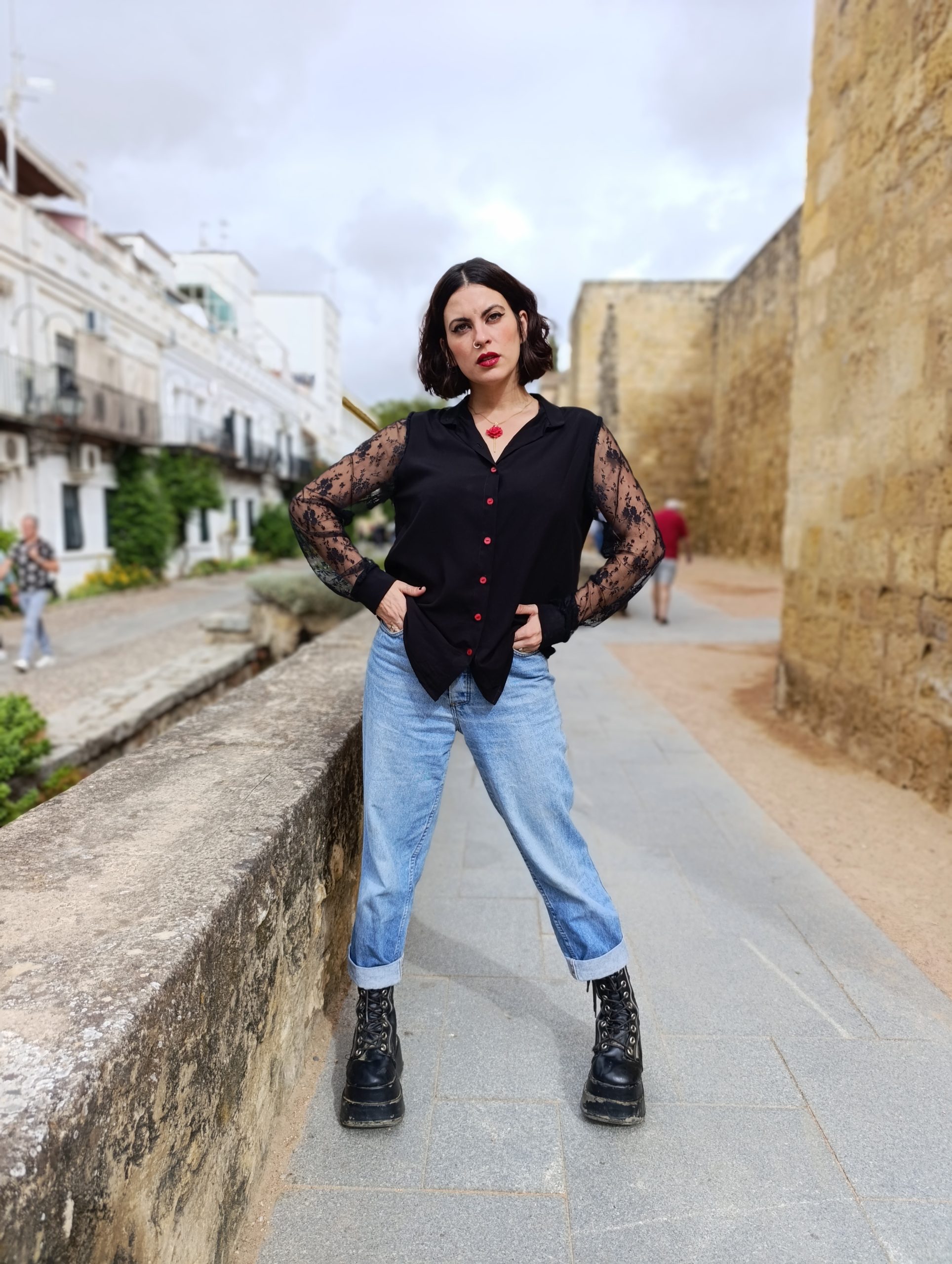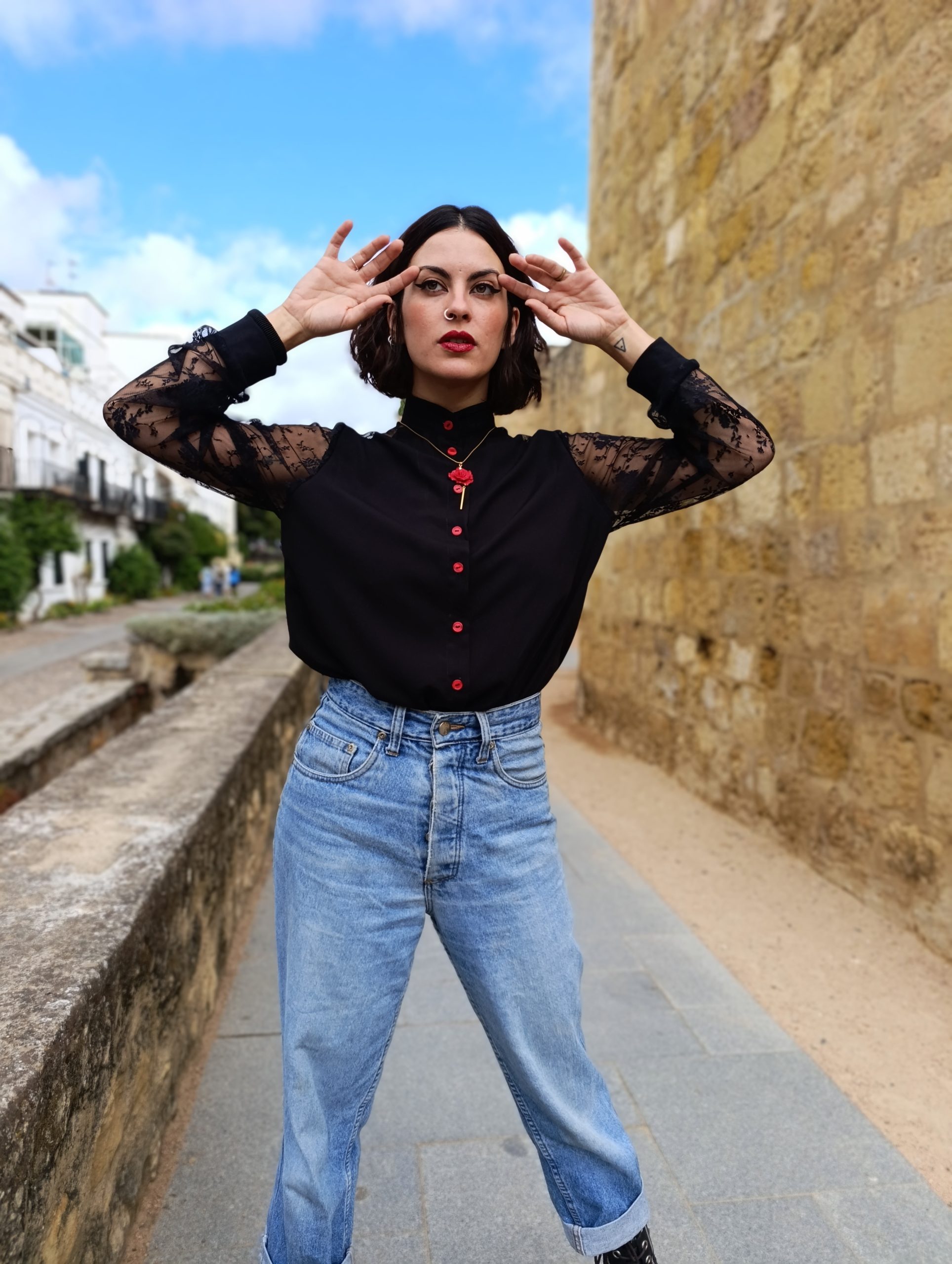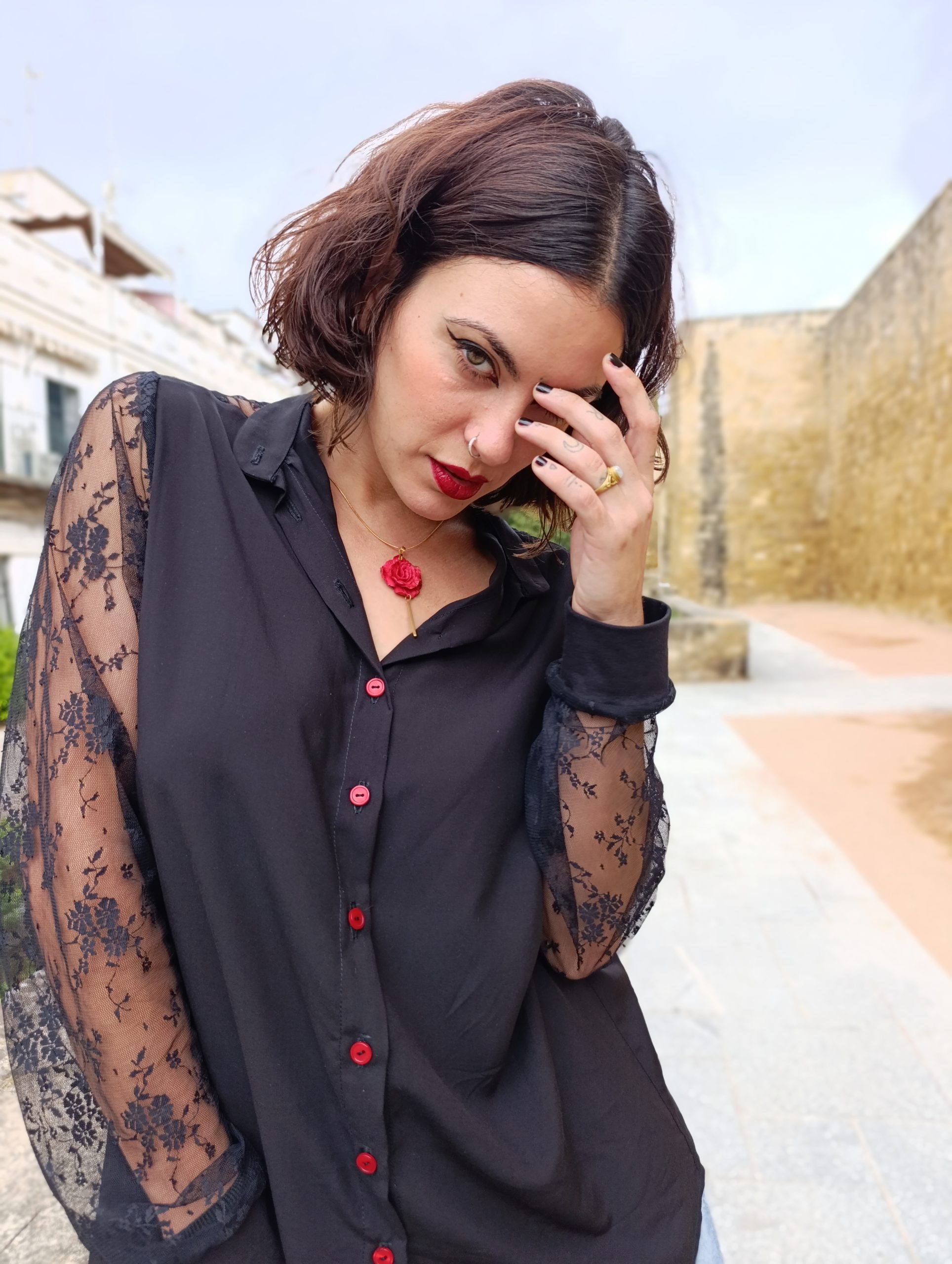 Camisa Cuervo, tejido de viscosa con mucha caída y suave al tacto, cuello tirilla, abotonada, mangas de encaje y puños de punto de algodón.