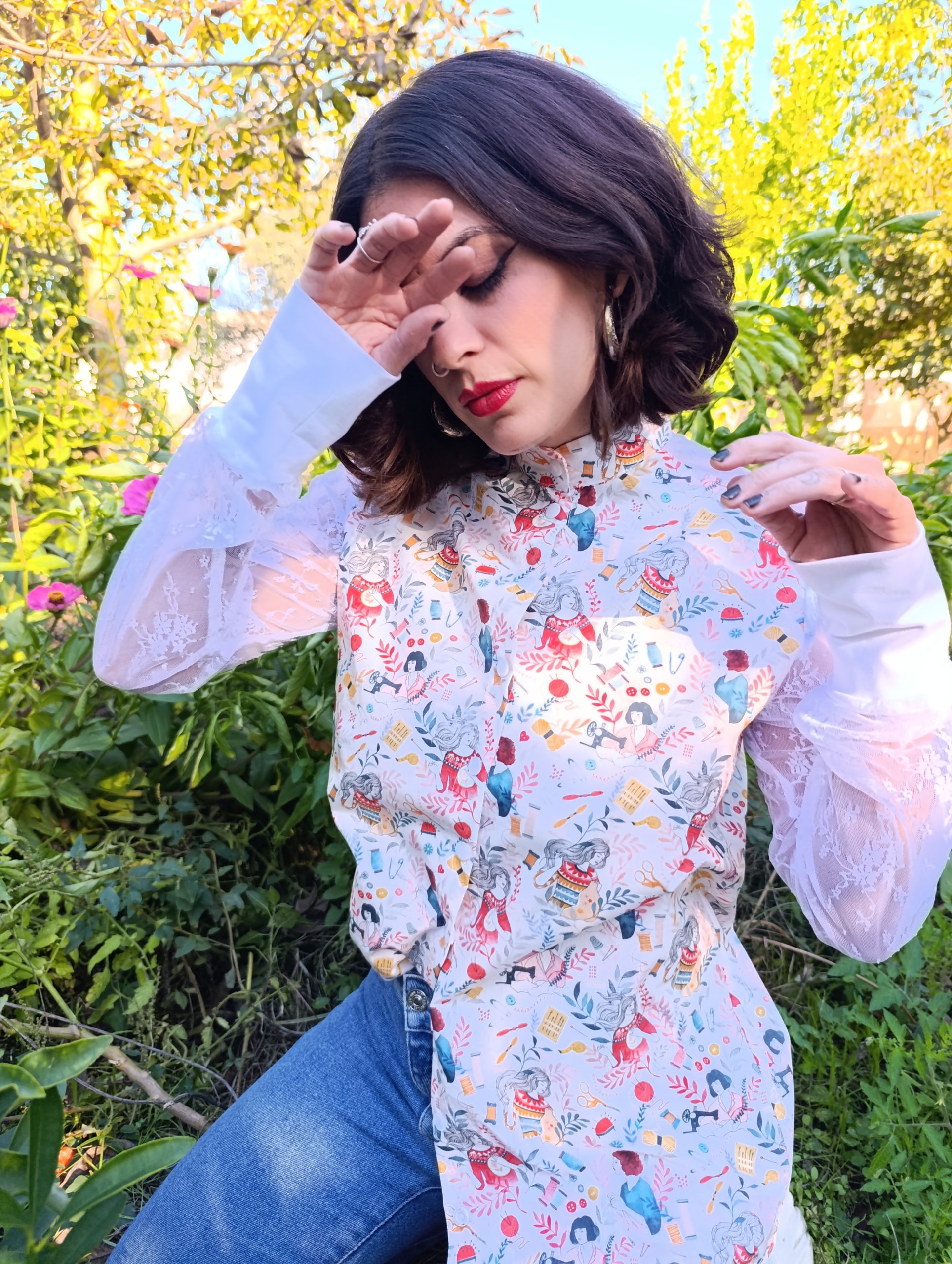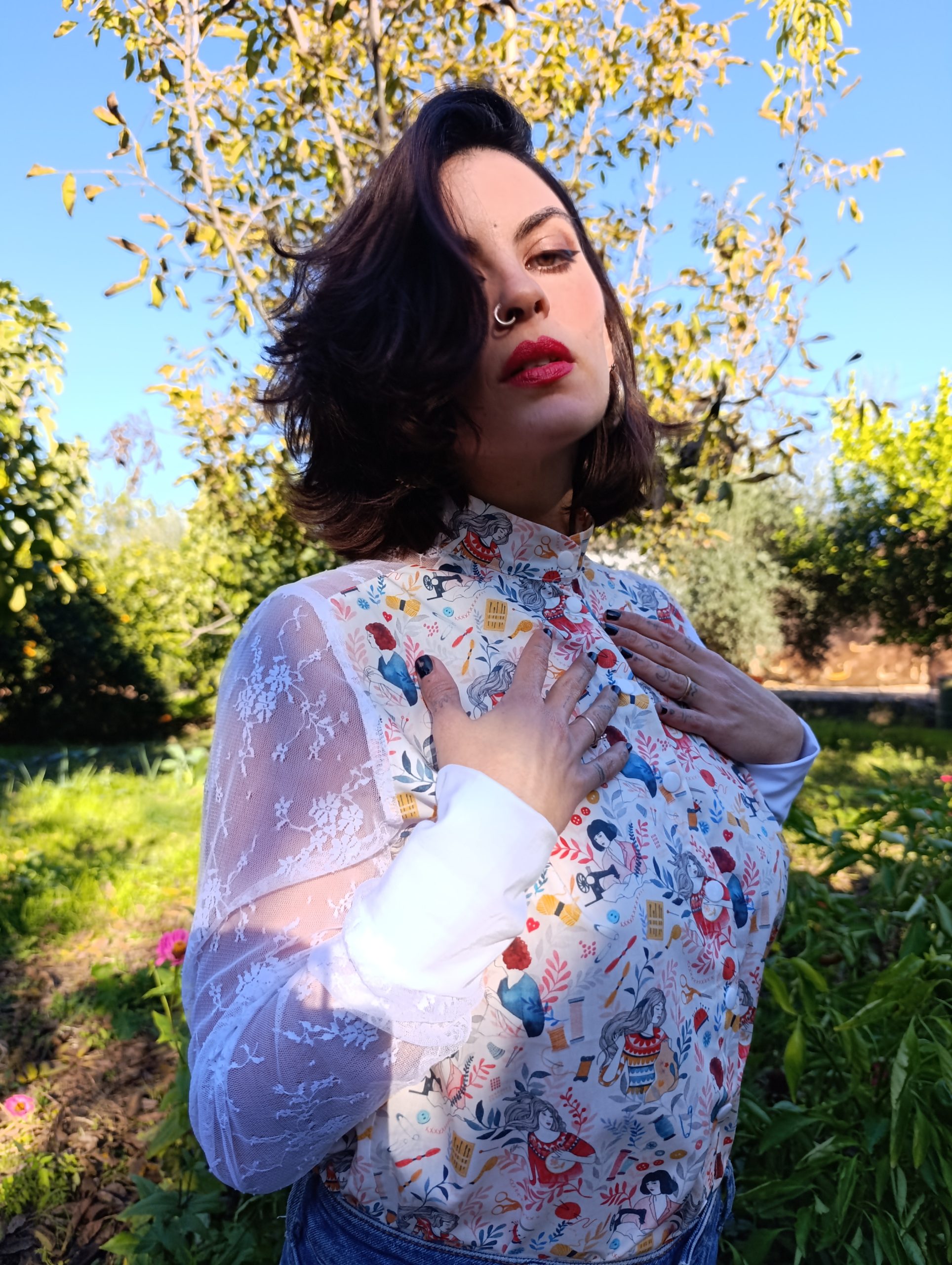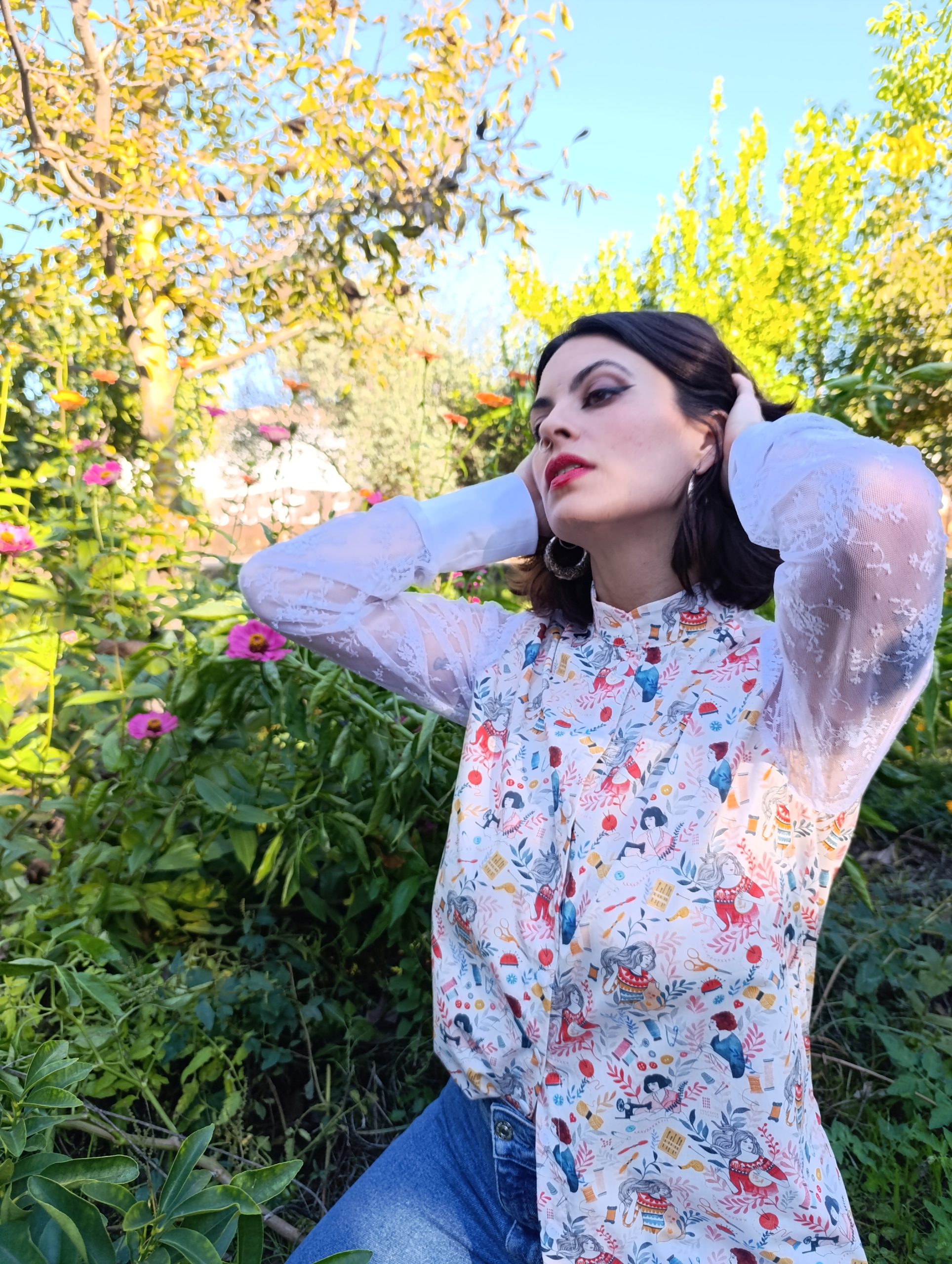 Camisa Sira, tejido de algodón orgánico y suave al tacto, cuello tirilla, abotonada, mangas de encaje y puños de punto de algodón.