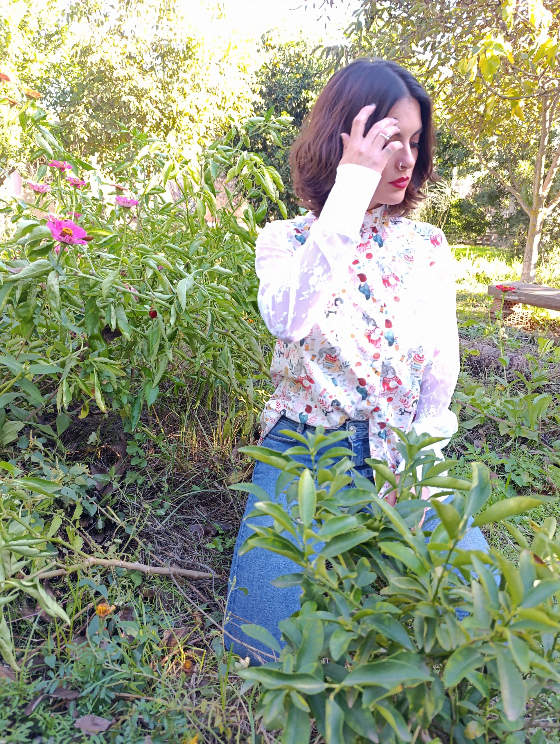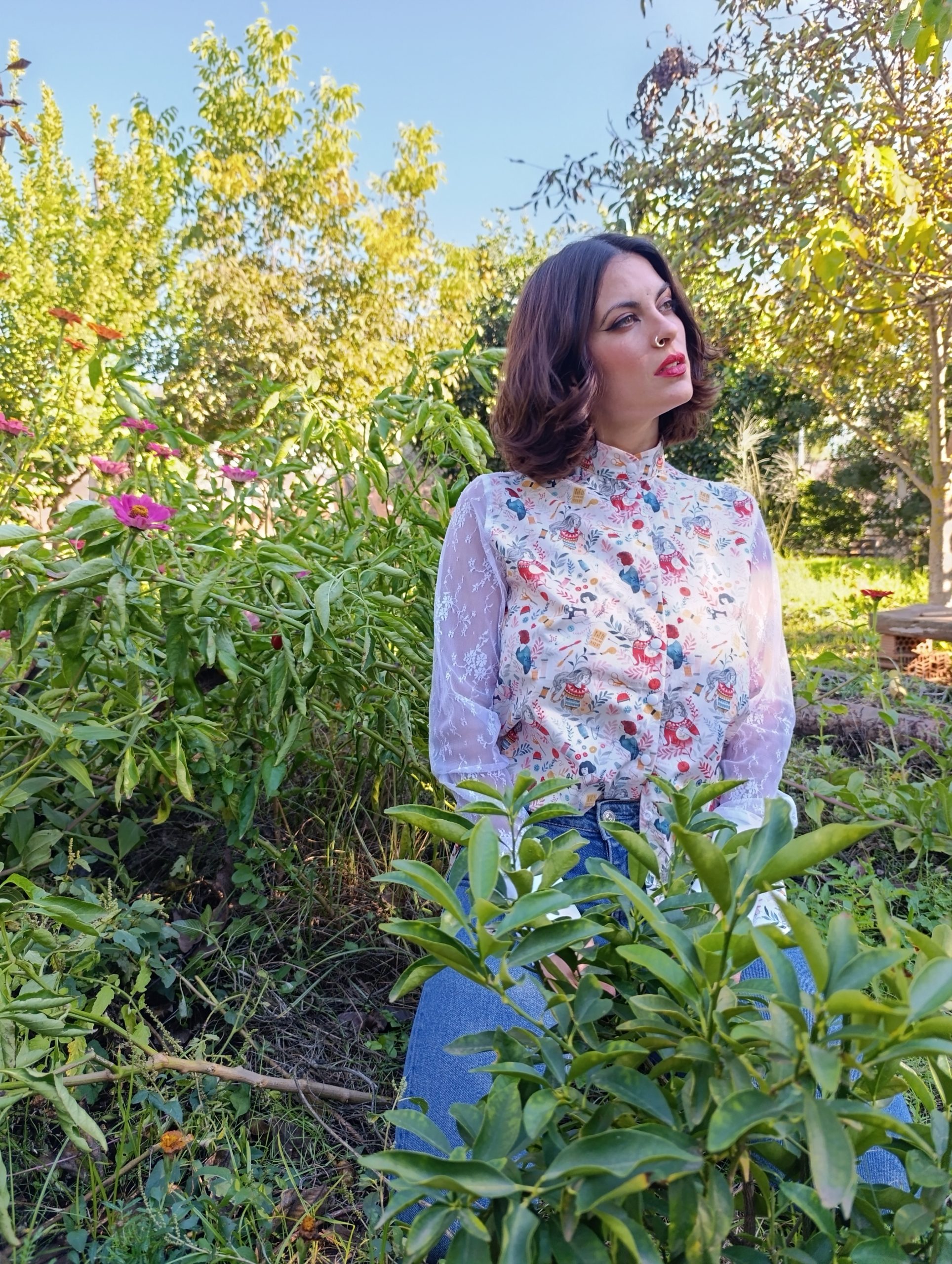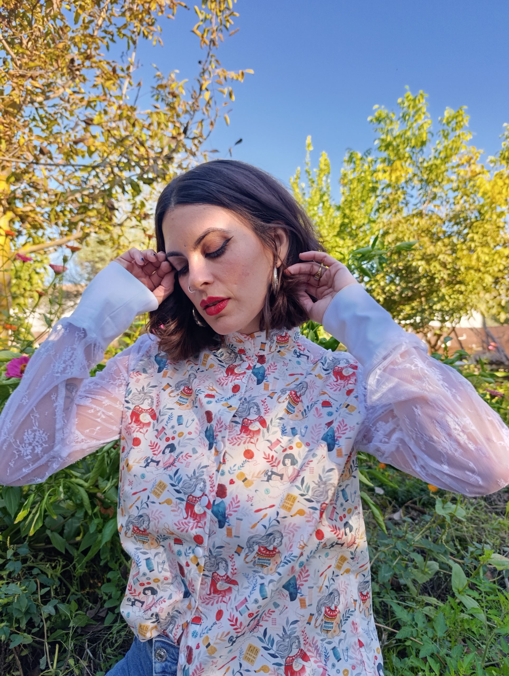 Camisa Sira, tejido de algodón orgánico y suave al tacto, cuello tirilla, abotonada, mangas de encaje y puños de punto de algodón.