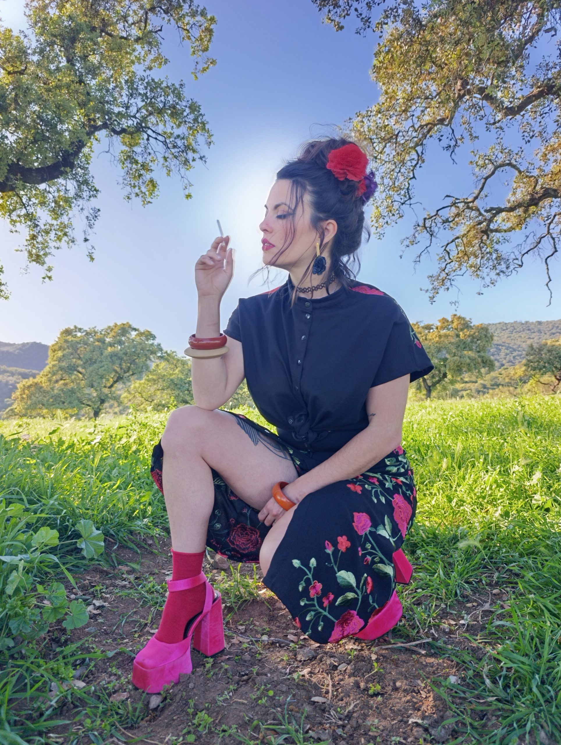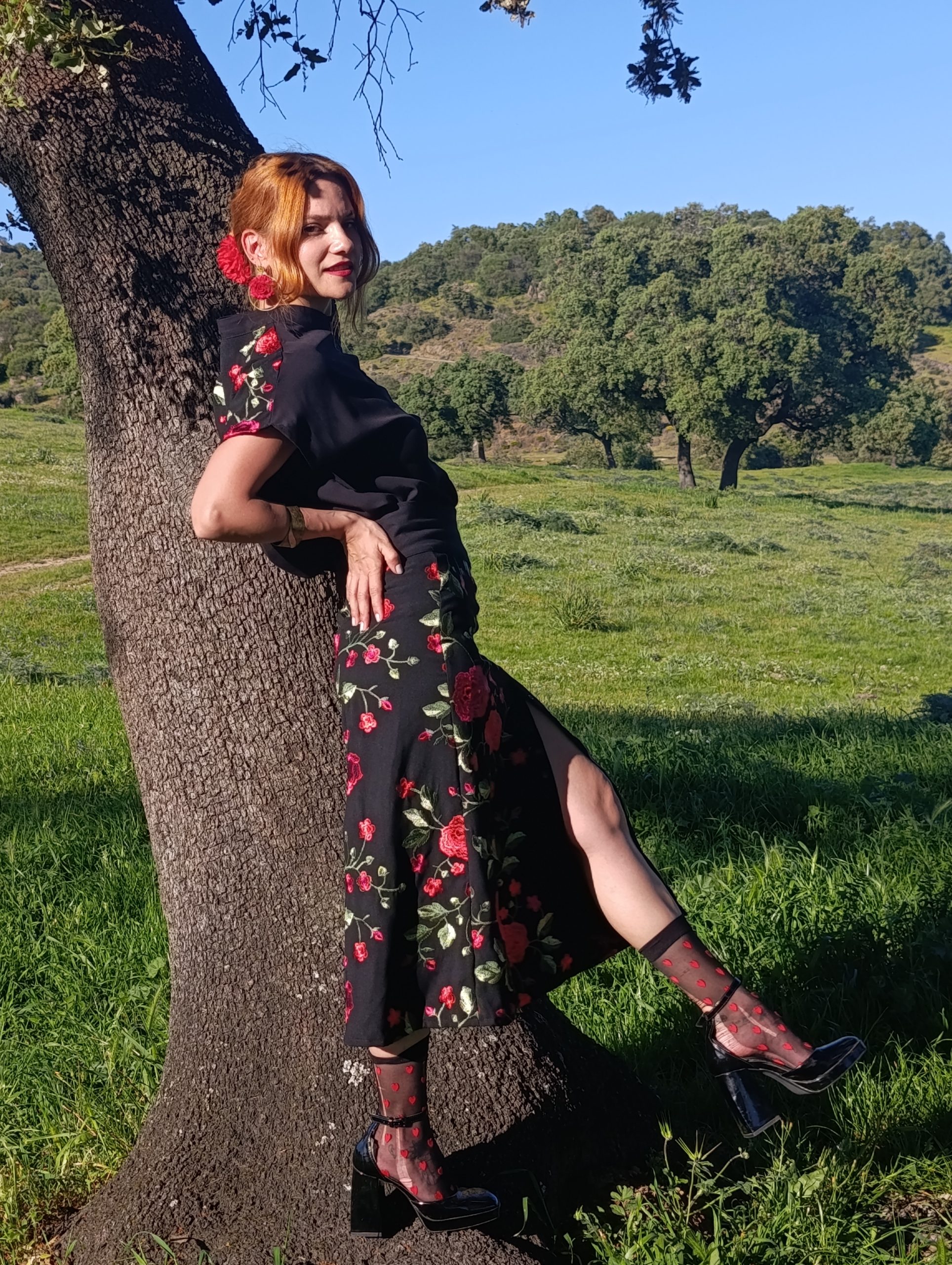 El bordado floral en hilo de seda aporta textura y profundidad sobre el negro, creando un contraste sutil pero lleno de carácter.