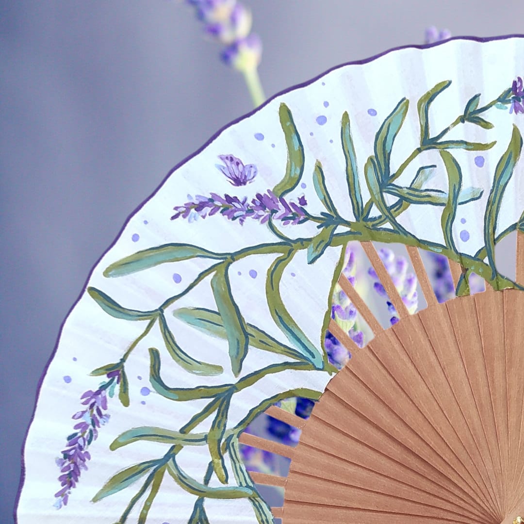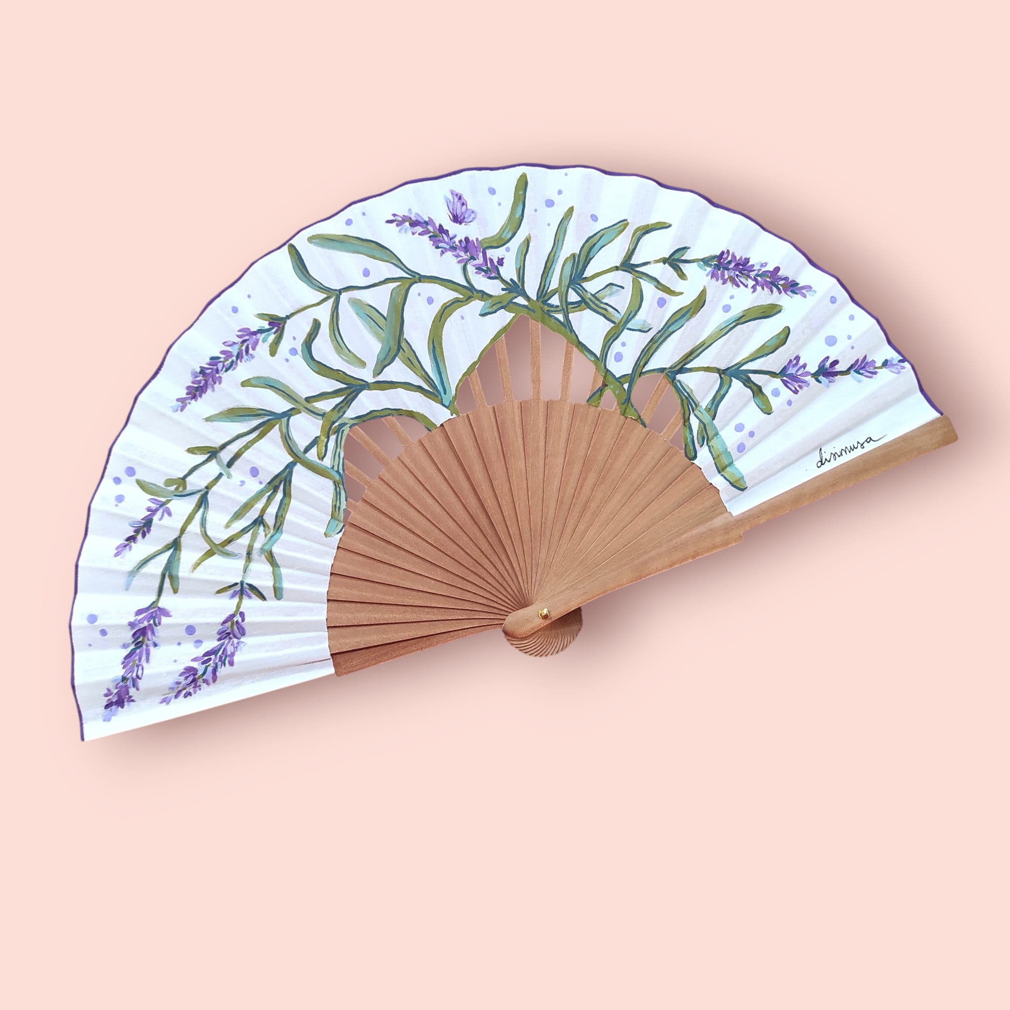 Cada abanico es un diseño propio y original. No se reproduce: solo existe una pieza de cada modelo. Está pintado a mano con acrílico textil y trabajado artesanalmente, incluyendo los recortes y acabados realizados uno a uno.