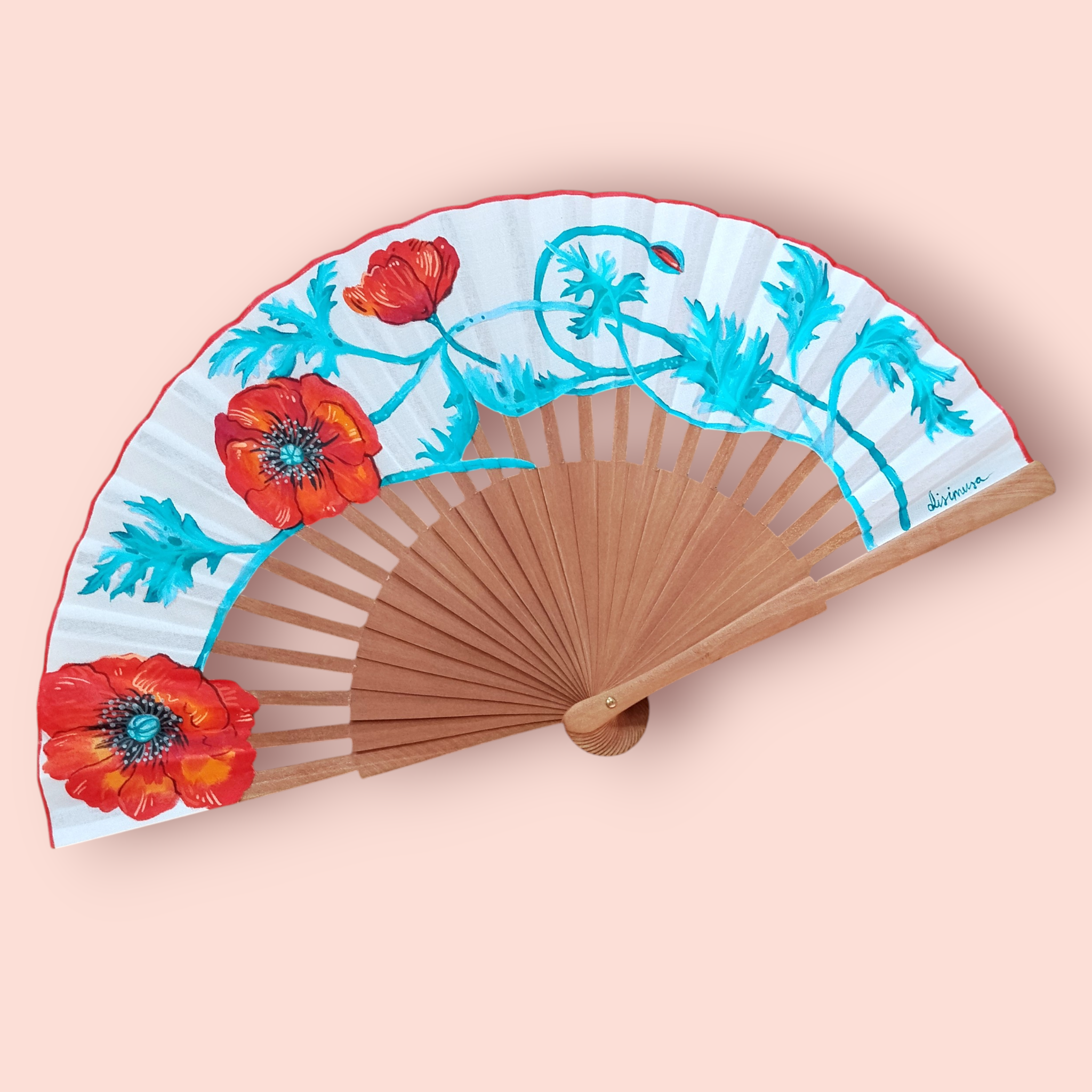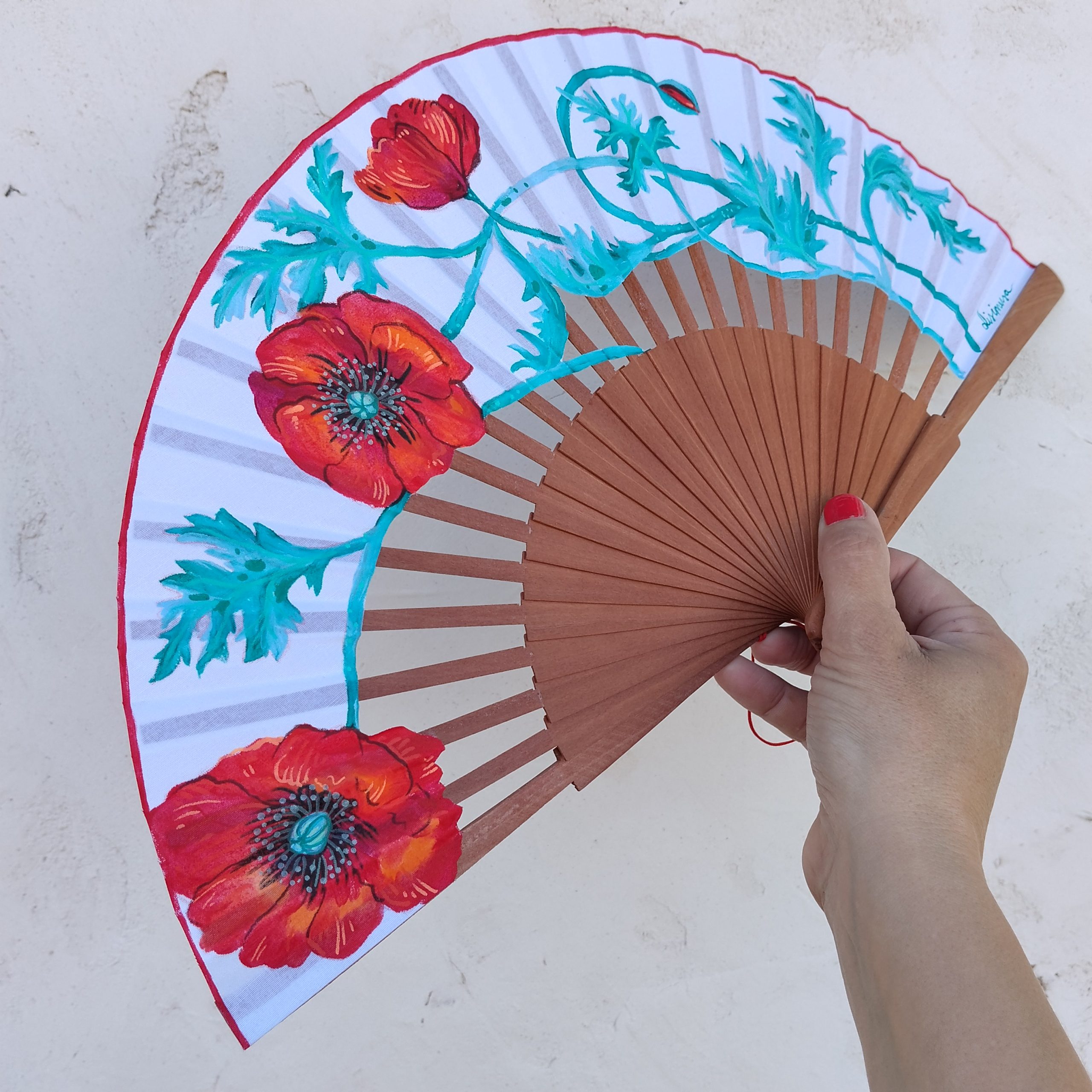 Cada abanico es un diseño propio y original. No se reproduce: solo existe una pieza de cada modelo. Está pintado a mano con acrílico textil y trabajado artesanalmente, incluyendo los recortes y acabados realizados uno a uno.