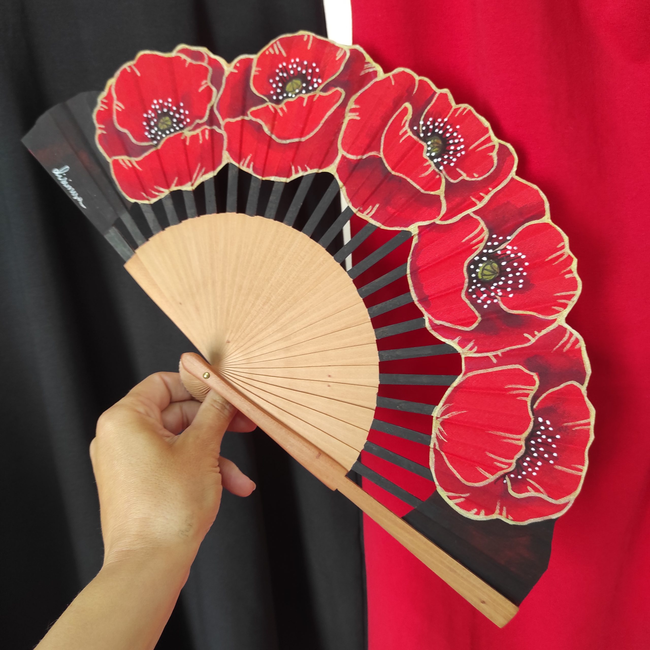 Abanico de 23 cm pintado a mano en España, elaborado en madera de peral y país de algodón, materiales resistentes y de gran calidad.